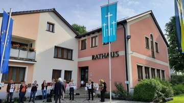 Im ersten Teil des Festprogramms stand nach dem Sammeln und Aufstellen am Rathausplatz ein hauptsächlich von den Jugendlichen selbst gestaltetes, internationales Gedenken am Ehrenmal beim Rathaus im Mittelpunkt. Die Eröffnungsrede hielt Hartmut Schendzielorz, welcher dem Jugendprojekt seit seiner Gründung 2002 vorsteht. Nach der Begrüßungsrede durch Landrat und Vizepräsident Reisinger verlasen die Projektwochenteilnehmerinnen und –teilnehmer in ihren jeweiligen Landessprachen das Totengedenken. Anschließend wurde zu den Klängen des Antikriegsliedes „Wo sind all‘ die Blumen hin“ von den Anwesenden je eine Blume in ein dafür vorbereitetes Holzkreuz gesteckt. Nach diesem Gedenken marschierten die Teilnehmer und Gäste in einem Kirchenzug mit Musik zum Harranger, um den Festgottesdienst mit Pfarrer Benny Joseph in der Katholischen Kirche zu feiern. Direkt nach dem Gottesdienst wurden „Europa-Luftballons“ der Projektwochen-Teilnehmerinnen und –teilnehmer in den Himmel gelassen, um so in den zweiten Teil des Festprogramms überzuleiten.