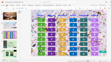 Unter der Anleitung der Konrektorin Dr. Svenja Meindl, Lehrerin für evangelische Theologie und Deutsch, haben insgesamt 18 Schülerinnen und Schüler der 9. Klasse (evangelische Religion) einen sehr originellen Beitrag eingereicht. Dabei haben sie in Anlehnung an die bekannte Quizshow „Jeopardy“ ein Quiz entwickelt, dass sich vorrangig dem Thema Frieden und seiner Bedeutung für die Schüler widmet. Entsprechend heißt das Spiel „Peace-opardy“. Das Spiel ist in einer Powerpoint-Präsentation erstellt. Damit soll es laut den daran beteiligten Schülern „universell einsetzbar“ sein, z. B. auch an anderen Schulen, um möglichst viele Jugendliche zu erreichen. Das Spiel solle aber nicht in der online-Version gespielt werden, sondern in einem digitalen Endgerät im Programm Powerpoint geöffnet werden, damit alle seine Funktionalitäten gegeben sind.