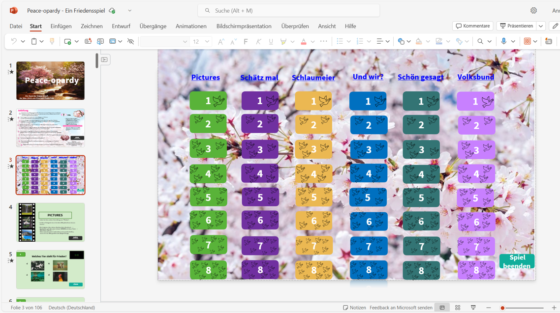 So gibt es dann verschiedene Bilder, zu denen die Jugendlichen gefragt werden, was sie damit verbinden (beispielsweise Bilder von Naturlandschaften, brennenden Städten, Soldaten, streitenden Personen etc.). Insgesamt gibt es sechs verschiedene Kategorien mit jeweils acht Fragen. Beantwortet man die erste Frage richtig, erhält man (symbolisch) eine Friedenstaube, bei acht korrekt beantworteten Fragen innerhalb einer Kategorie gibt es acht Friedenstauben. Ziel des Spiels ist es, möglichst viele Friedenstauben zu gewinnen, sprich möglichst viele Fragen korrekt zu beantworten. Die Kategorien lauten dabei: „Pictures“, „Schätz mal“, „Schlaumeier“, „Und wir?“, „Schön gesagt“, und als letzte Kategorie „Volksbund“. Gerade mit der letzten Kategorie zum Volksbund Deutsche Kriegsgräberfürsorge e. V. möchte die Gruppe erreichen, dass der Volksbund und seine Arbeit bekannter gemacht werden und sich auch junge Menschen mit ihm beschäftigen. So wird unter anderem in der Kategorie „Volksbund“ dann auch gefragt, welche Aufgaben der Volksbund habe, wie er sich finanziere, was sein Logo sei oder wann er gegründet wurde. Insgesamt umfasst das Spiel 106 Folien und ist damit ein sehr kurzweiliges, aber auch lehrreiches und interessantes Spiel.