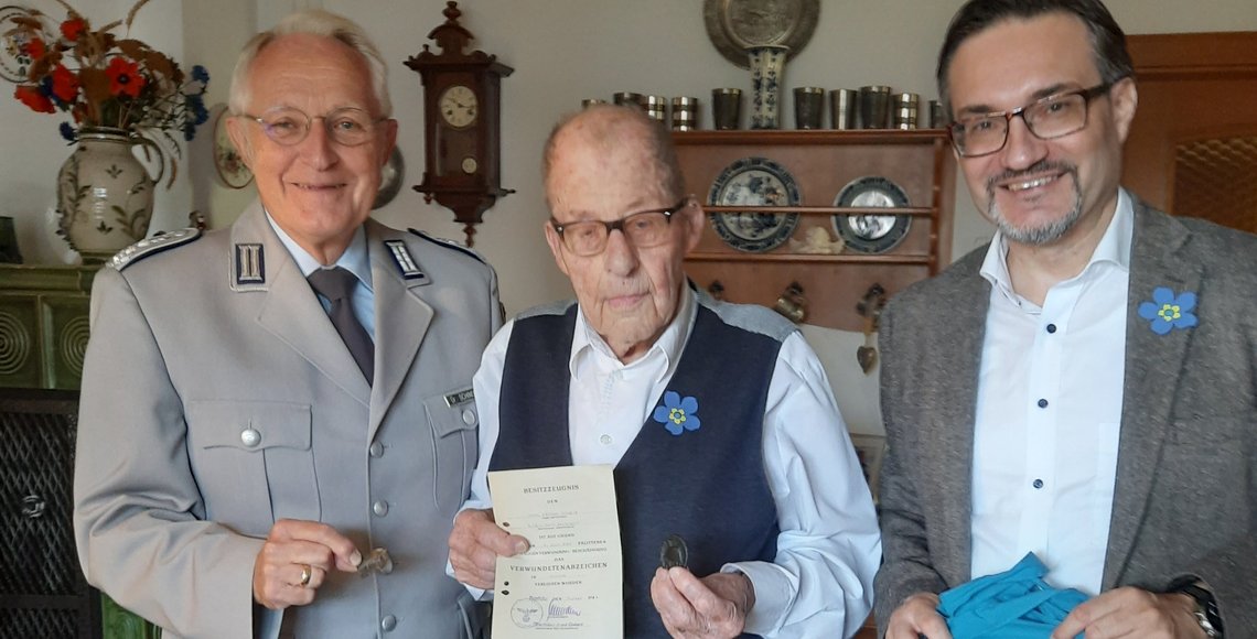 Am vergangenen Freitag hatte für Ottfried Schmidt ein langes Warten endlich sein gutes Ende gefunden. Er erhielt nach 80 Jahren das Verwundetenabzeichen, das ihm eigentlich schon am 27. Juli 1944 hätte verliehen werden sollen. Aber da gab es keines mehr. Wie nun Schmidt letzten Endes doch noch an das Abzeichen gelangte, ist eine interessante Geschichte und auch eng mit dem Volksbund verbunden. Dazu konnte er auch viel über seine Erlebnisse im Zweiten Weltkrieg erzählen.